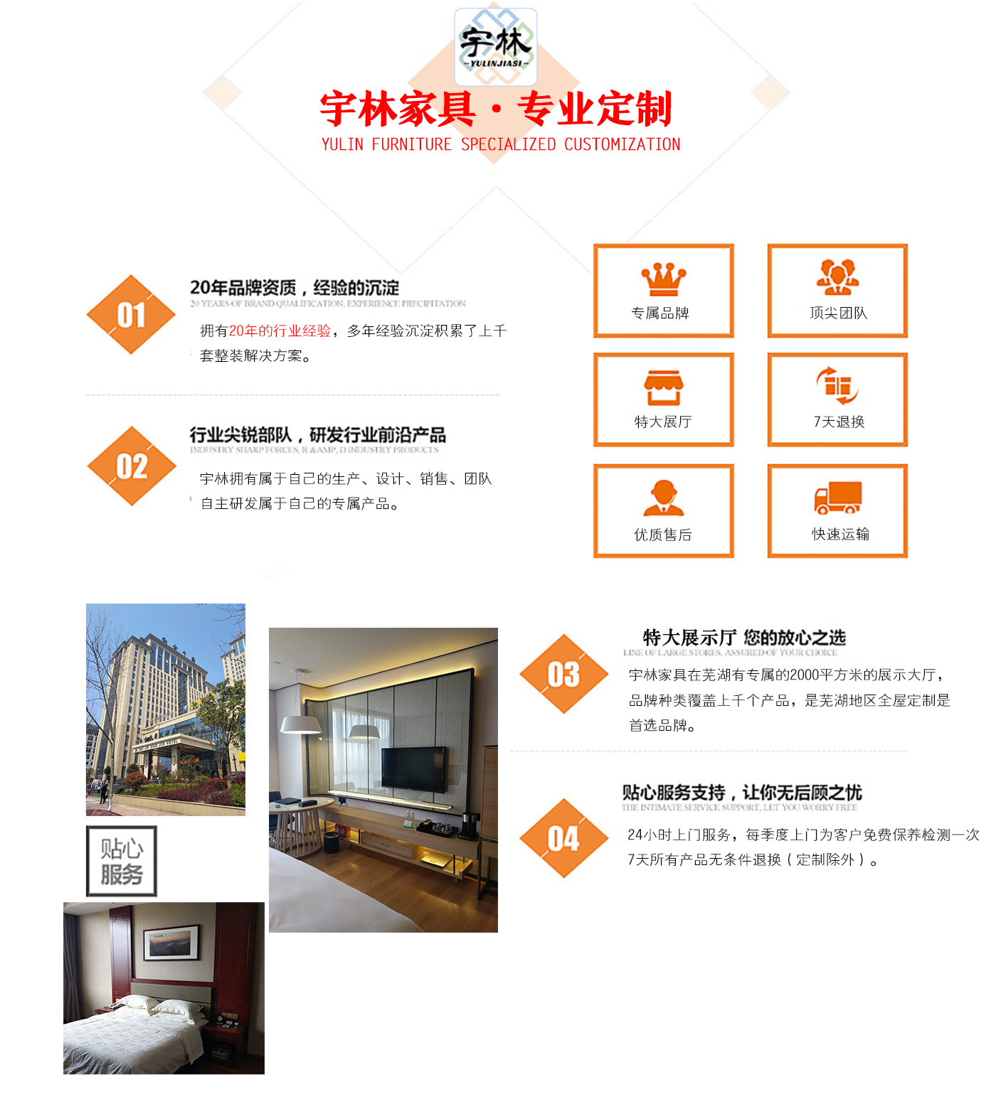蕪湖宇林工貿(mào)有限公司創(chuàng)建于1996年,位于蕪湖高新技術開發(fā)區(qū)南區(qū),占地面積13000余平方米。是一個集研發(fā)、設計為一體的綜合性公司,公司主營整體家居定制、酒店家具定制、娛樂場所配套家具以及軟體系列,團隊,銳意革新、進去不息的理念,逐漸成為蕪湖家具行業(yè)的生產(chǎn)廠家,并在2006年注冊了“宇林”牌商標。宇林品牌家具依現(xiàn)代與古典相結(jié)合的多種實木家具、實木貼皮家具。家具做工精細,多用人工雕刻;其自然、典雅的風格在很大程度上引導著人...